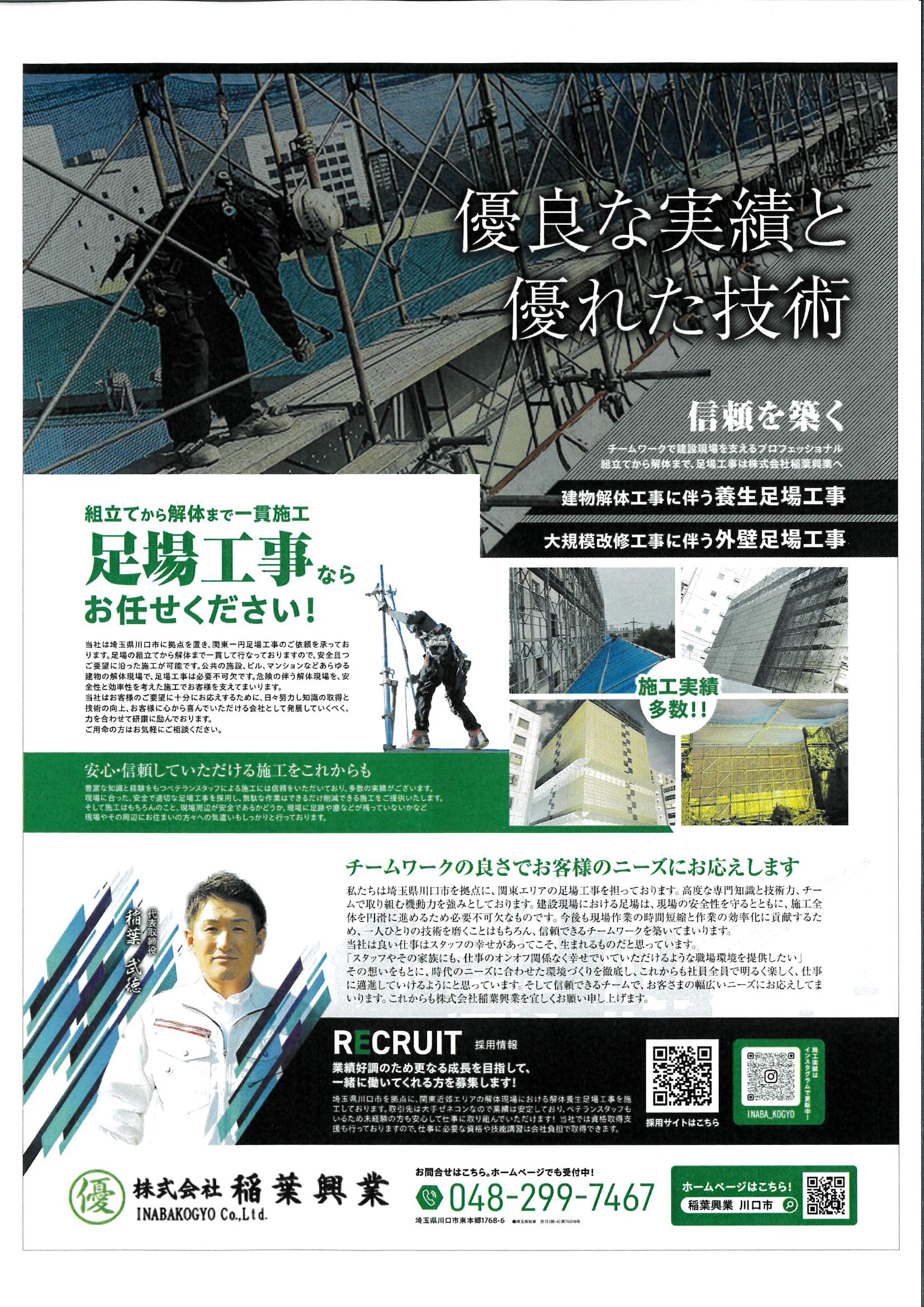 埼玉県川口市の株式会社稲葉興業は、関東一円エリアにおける足場工事のご依頼を承っております。足場の組み立てから、解体まで一貫して行なっておりますので、安全且つご要望に沿った施工が可能です。豊富な知識と経験をもつベテランスタッフによる施工には信頼をいただいており、豊富な実績がございます。実績を一部ご紹介いたします。ご用命の方はぜひ弊社へご依頼ください。